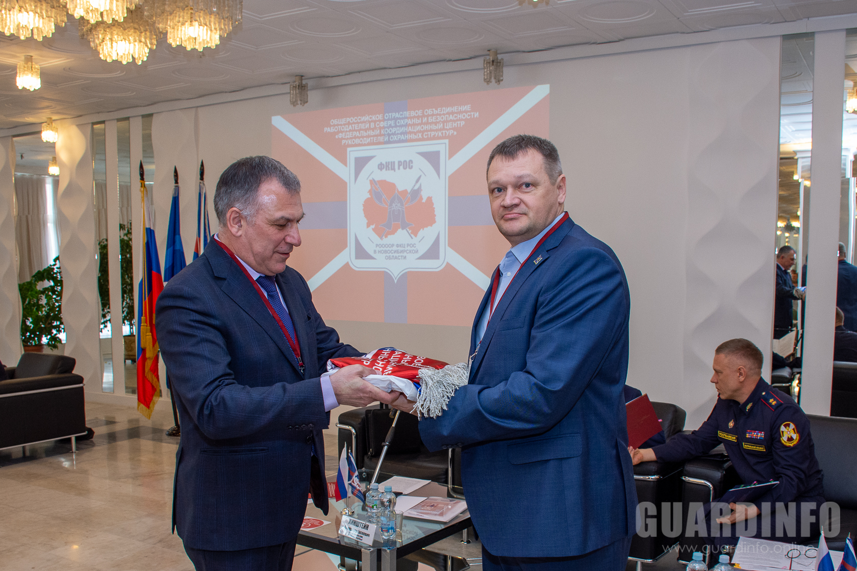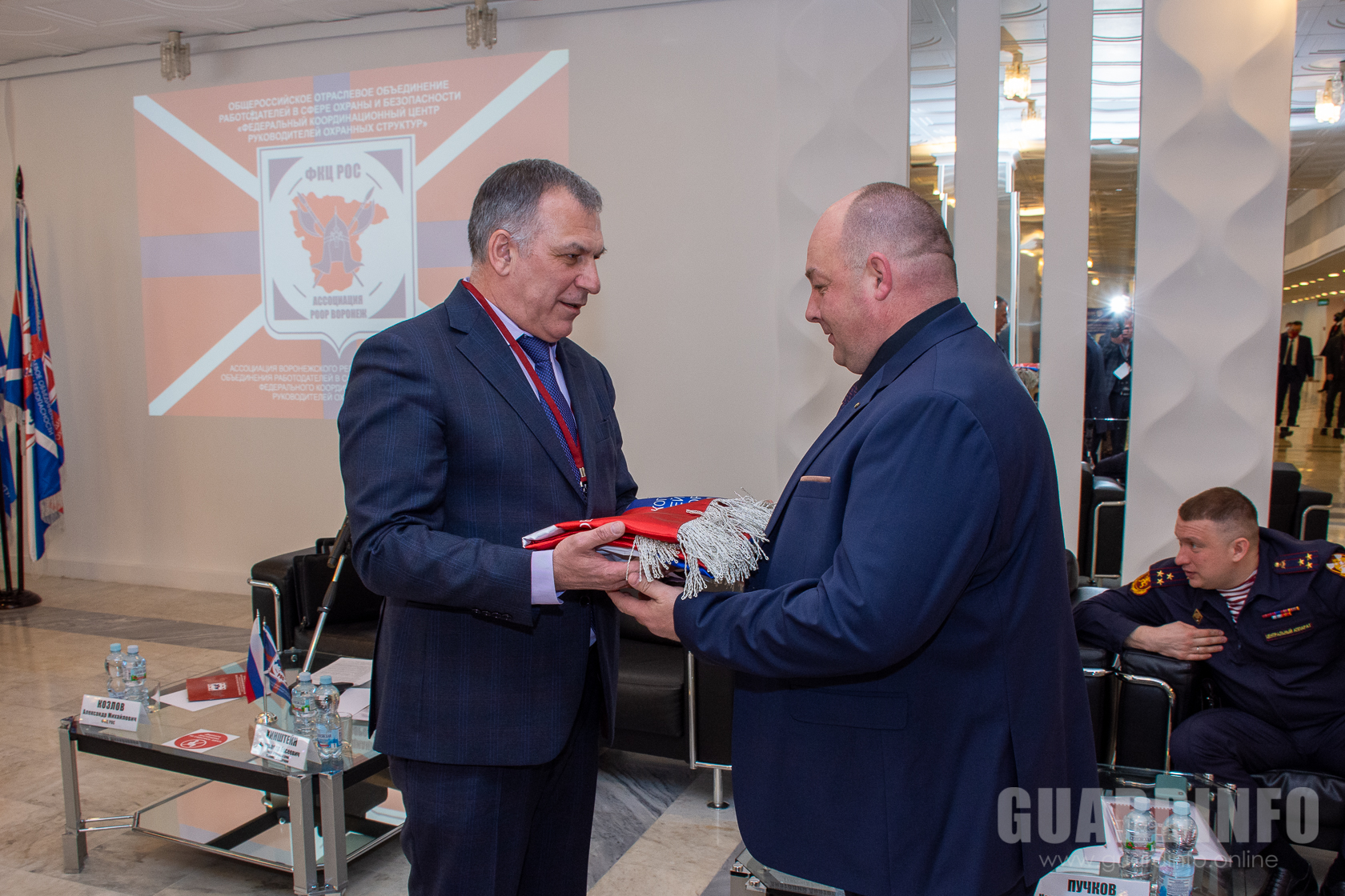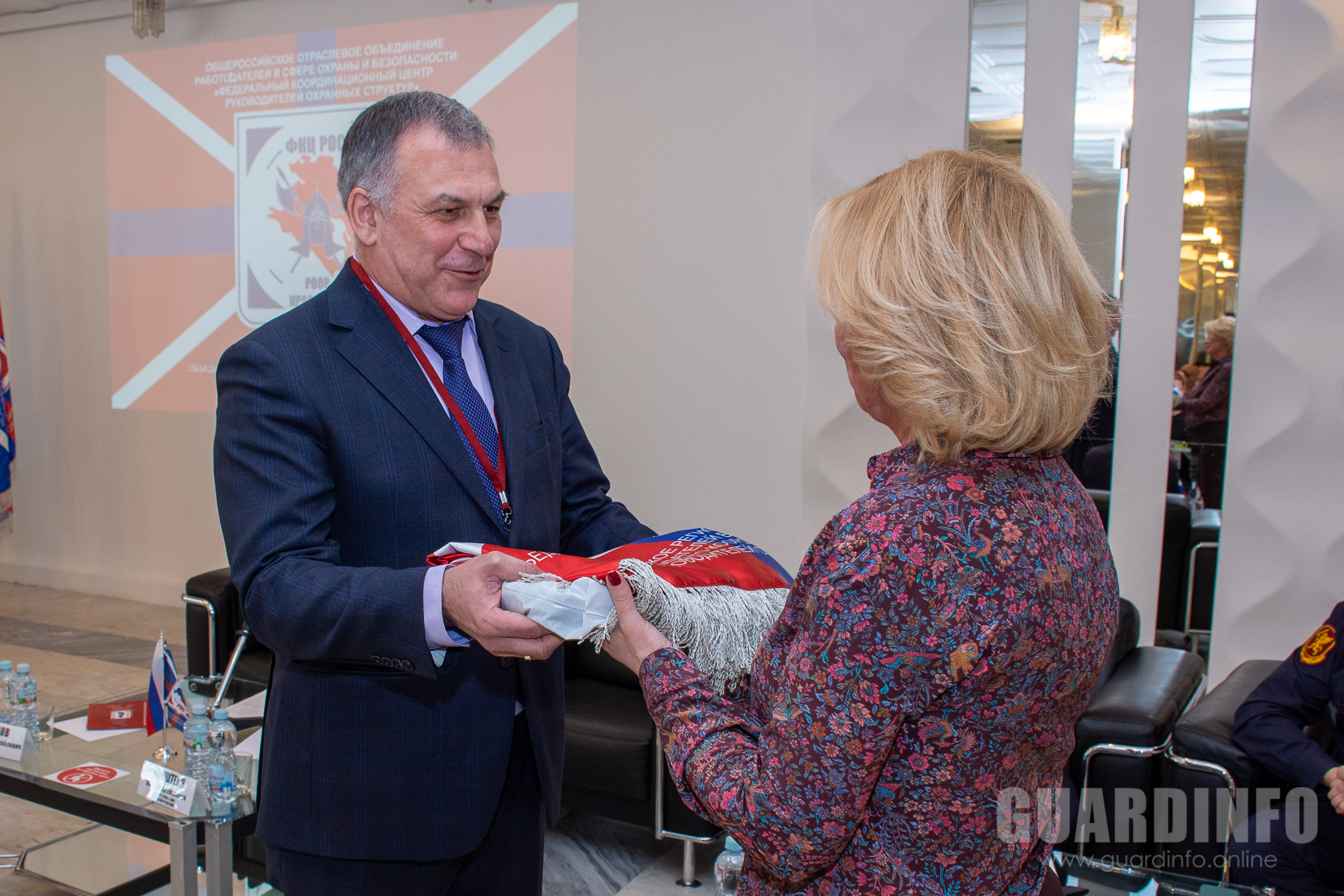 Завершая протокольную часть мероприятия Президент ФКЦ РОС представил собравшимся сигнальные экземпляры юбилейных наград, посвященных тридцатилетию частной детективной и охранной деятельности в России.