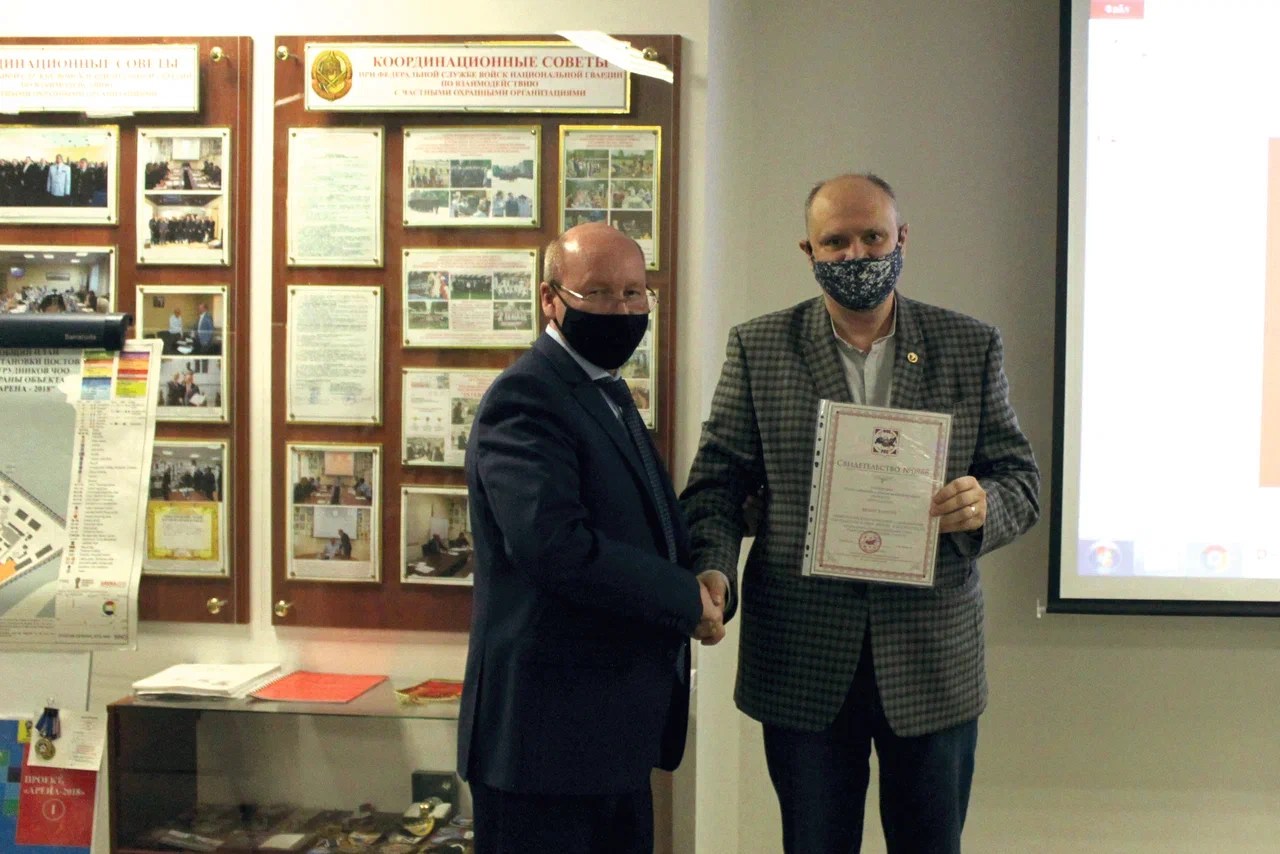 По завершении заседания член Правления ФКЦ РОС, член федерального Координационного Совета по вопросам частной охранной деятельности, Генеральный Директор Ассоциации охранных и юридических компаний «Беркут» П.В. Ковалев вручил председателю Комитета торгово – промышленной палаты Нижегородской области по безопасности предпринимательской деятельности, Генеральному директору группы охранных и юридических компаний «Витязь-НН» В.А. Райскому Свидетельство о вхождении возглавляемой им организации в Общероссийское отраслевое объединение работодателей в сфере охраны и безопасности (ФКЦ РОС);